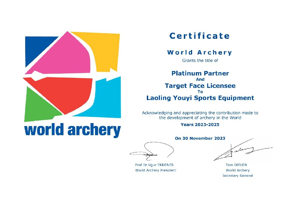 目前,主要生產(chǎn)和銷售射箭比賽及訓練專用器材,包括:箭靶、靶紙、靶架、號碼牌、風向旗、計時記分器等場地器材設備;反曲弓、復合弓、傳統(tǒng)弓、瞄準器、防震桿等弓箭裝備;箭壺、護胸、護臂、護指等各類箱包護具。公司所生產(chǎn)的射箭器材已通過國際射箭聯(lián)合會及中國射箭協(xié)會CAA認證。